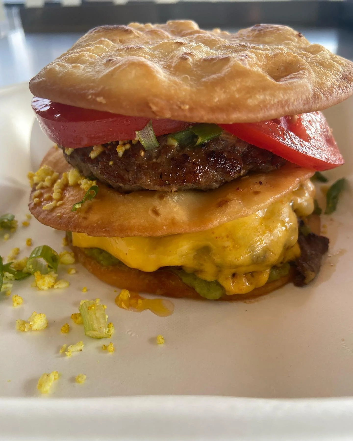 Crispy fried potatoes, scrambled eggs, sausage, American cheese, green onion, flour tortilla, sausage gravy | Make it naughty: seasoned with creole spices, topped with pico, jalapeรฑo, fresh cilantro - 2